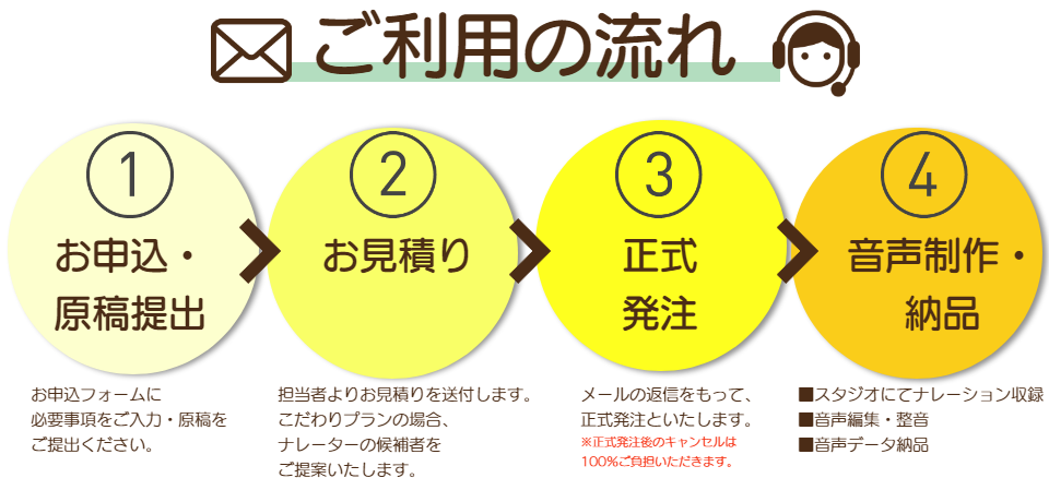はじめてナレーション収録を外注する場合や、複数のナレーターを聞き比べて決めたい等、お気軽にご相談ください。